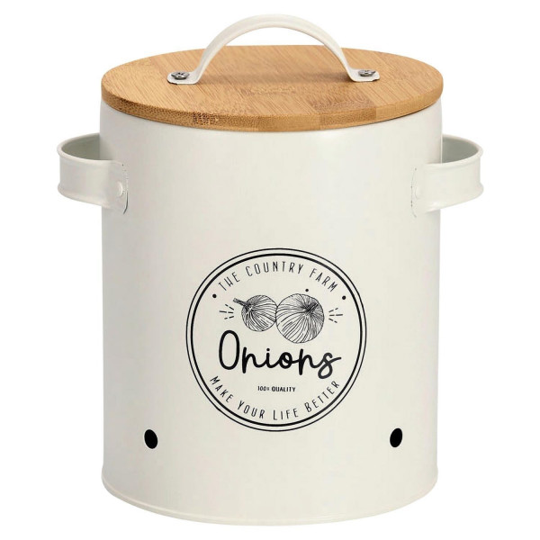 Die Vorratsdose MOHAN von Zeller ist aus weißem Metall gefertigt und verfügt über einen braunen Deckel aus Bambus. Mit einem stilvollen Motiv und dem Schriftzug "Onions" in Schwarz passt sie perfekt in jede Küche. Dank der Löcher im Design sorgt die Dose für optimale Luftzirkulation und hält Zwiebeln frisch. Mit einem Fassungsvermögen von 1900 ml, einem Durchmesser von 17,4 cm und einer Höhe von 19,5 cm bietet sie ausreichend Platz für Vorräte.