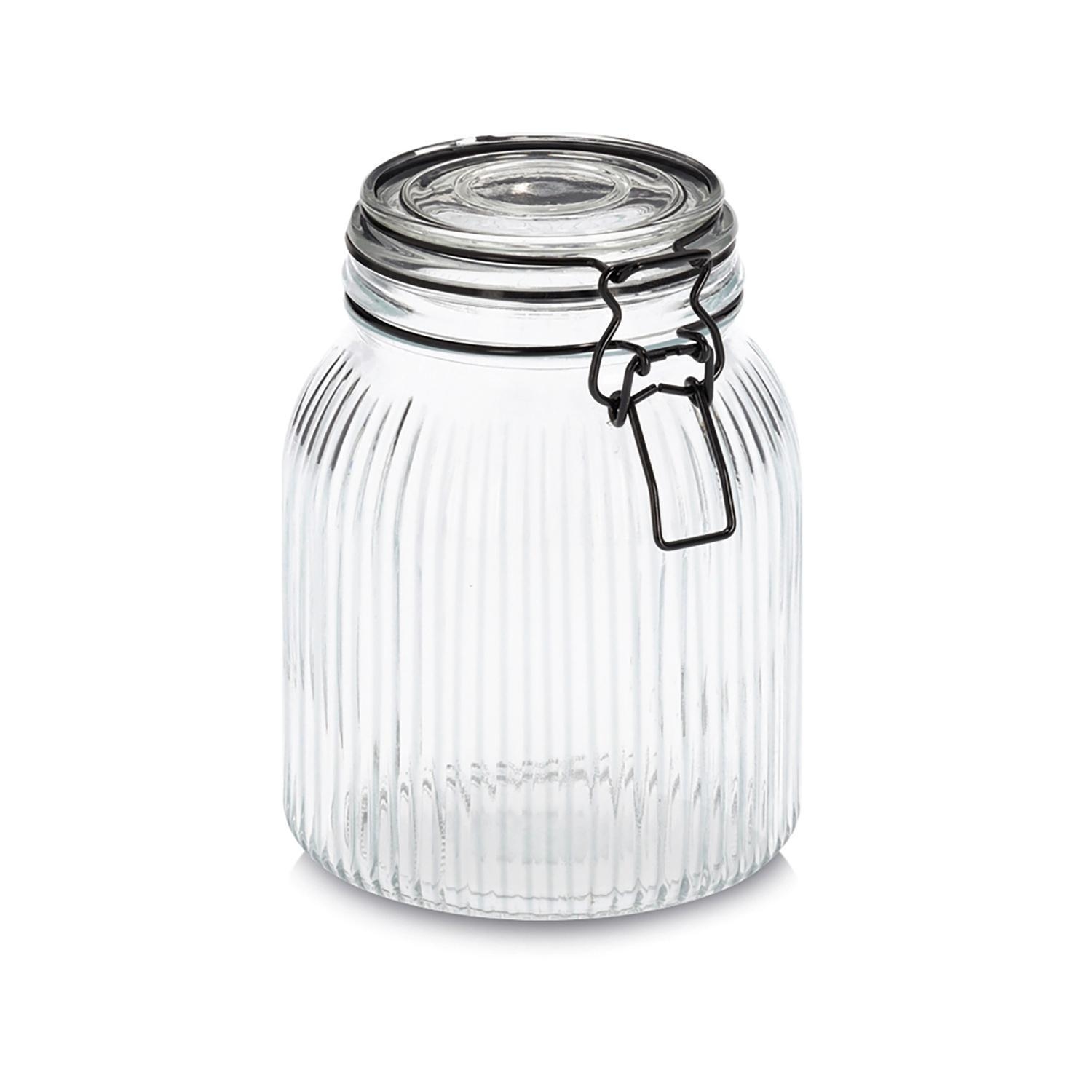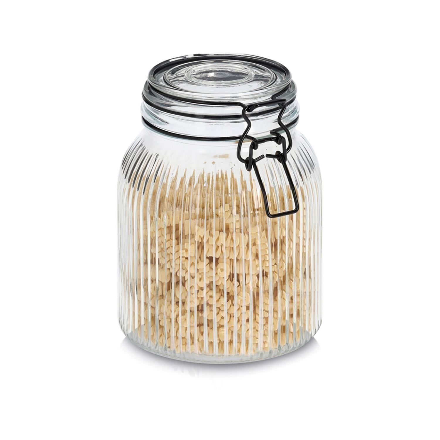 Das Vorratsglas WIPELO von Zeller vereint praktische Funktion mit stilvollem Design. Gefertigt aus transparentem Glas in eleganter Rillenoptik, ermöglicht es jederzeit einen klaren Blick auf den Inhalt. Der luftdichte Deckel mit schwarzem Bügelverschluss bewahrt trockene Lebensmittel wie Mehl, Zucker oder Müsli zuverlässig frisch. Mit einem großzügigen Fassungsvermögen von 1700 ml bietet es reichlich Platz für Ihre Vorräte.