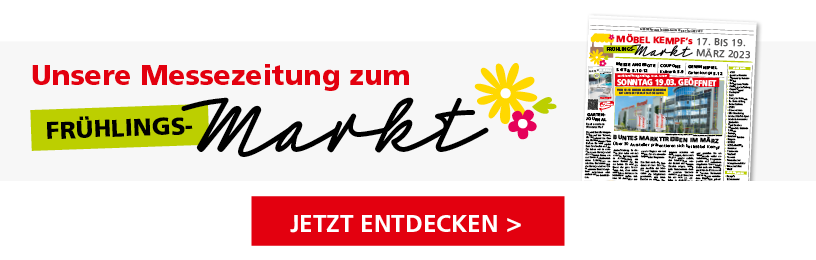 Zur Feier haben wir auch am Sonntag, den 19.03. für Sie geöffnet. Alles rund um unsere Frühlingsmarkt erfahren Sie in unserer Messezeitung!