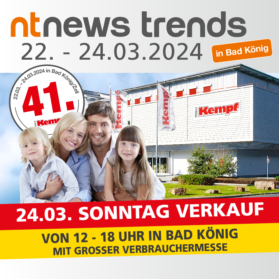 Vom 22.03.-24.03. findet unsere 41. News Trends Verbrauchermesse in Bad König statt! Von Freitag bis inkl. Sonntag haben wir für Sie geöffnet und bereiten Ihnen ein erstklassiges Einkaufswochenende vor:
