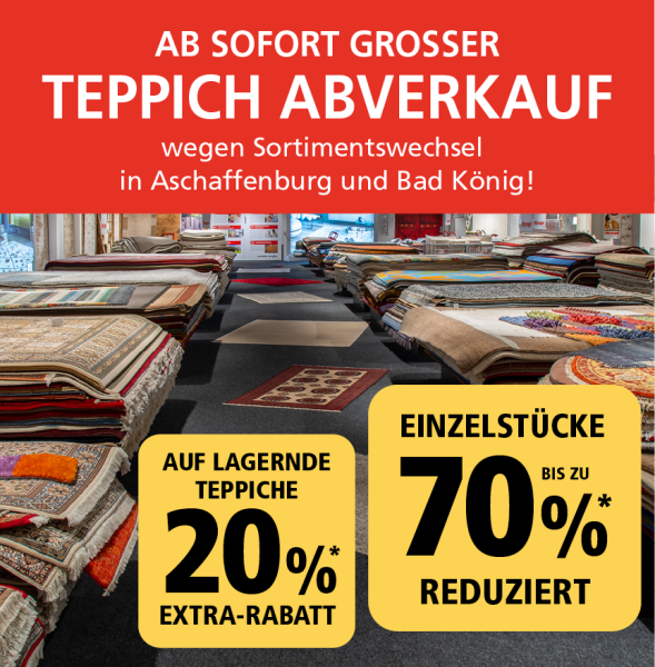 Ob modern, klassisch oder zeitlos – entdecken Sie hochwertige Teppiche in großer Auswahl zu besonders attraktiven Preisen. Aber nur solange der Vorrat reicht und nur in unseren Filialen vor Ort in Aschaffenburg und Bad König.