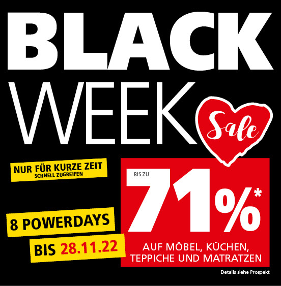 In unserer BLACK WEEK gibt´s für Sie bis zu 71 % Rabatt auf Möbel, Küchen, Teppiche und Matratzen. Da ist mehr als nur ein Schnäppchen drin! Alle Angebot finden Sie vor Ort, im aktuellen Prospekt und natürlich auch im Onlineshop!