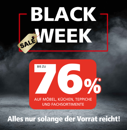 Und das war noch nicht alles: von BLACK FRIDAY bis CYBER MONDAY können Sie mit unserem BLACK-WEEK Zusatzrabatt 15 % auf fast alles sparen! Außerdem schenken wir Ihnen 15 € Sofort-Rabatt auf Ihren Boutique-Einkauf ab 80 €. Einfach Coupon im Gültigkeitszeitraum in unseren Einrichtungshäusern an der Kasse vorzeigen oder Rabattcode online einlösen und sparen! Alle weiteren Informationen finden Sie hier.
