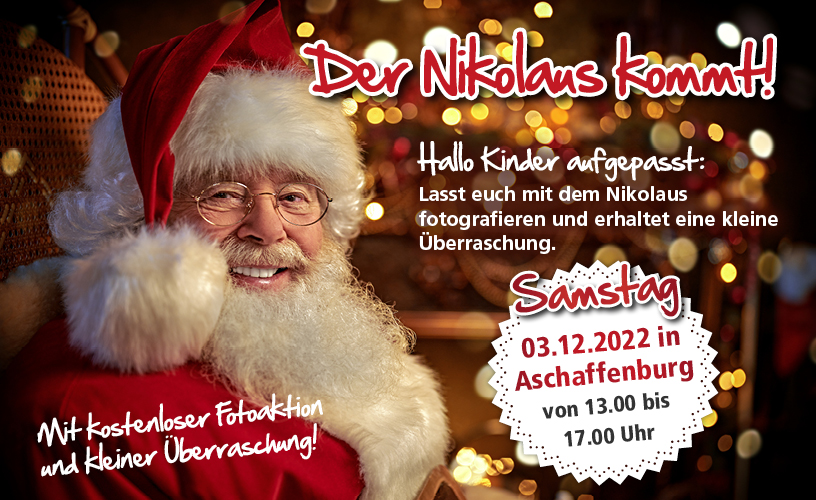Am 3.12. findet unsere jährliche Fotoaktion in Aschaffenburg statt. Kommen Sie auf ein Foto mit dem Nikolaus in unserem Einrichtungshaus vorbei. Zwischen 13-17 Uhr können Sie kostenlos an der Aktion teilnehmen. Für alle Kids gibt´s dazu noch eine kleine Überraschung!