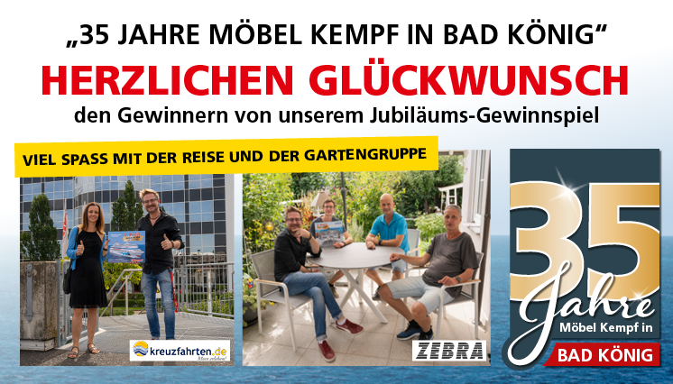 Im Frühjahr haben wir zur Feier unseres 35 Jahre Möbel Kempf in Bad König-Jubiläums ein großes Gewinnspiel für unsere Kunden veranstaltet. Zu gewinnen gab es: