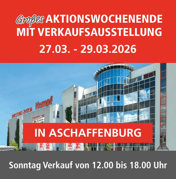 Vom 27. bis einschließlich 29.03. findet in Aschaffenburg unser großes Aktionswochenende mit Verkaufsausstellung statt! Gemeinsam mit der Stadt Aschaffenburg haben wir auch am Sonntag von 12-18 Uhr für Sie geöffnet!