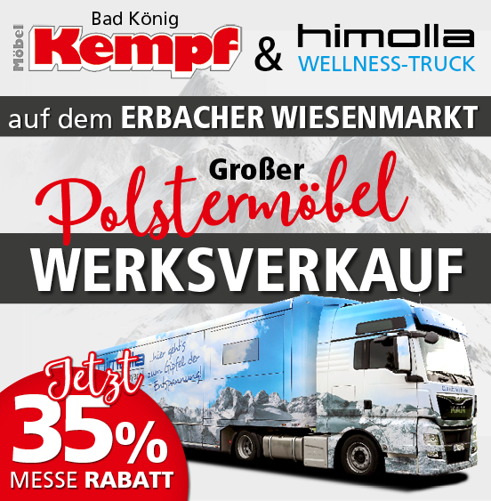 Qualität aus Bayern zum Erleben! Vom 21.07. bis zum 30.07. steht der Himolla Wellness-Truck in Kooperation mit Möbel Kempf auf dem Erbacher Wiesenmarkt. In Europas größtem mobilen Polster Studio können Sie die Sitzmöbel von Himolla testen und sich beraten lassen. Über 100 qm Ausstellungsfläche warten auf Sie! Weitere Infos finden Sie hier.