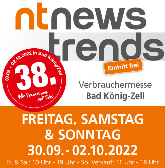 Am kommenden Wochenende findet unsere 38. News Trends Messe in Bad König statt. Von Freitag bis inkl. Sonntag haben wir für Sie geöffnet!